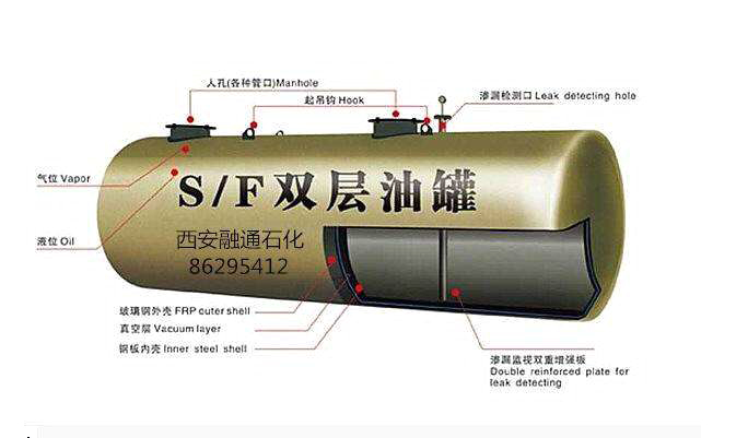 双层罐SF结构:1、内层:采用6mm厚的Q235-B钢板制造,与普通的厚度仅5mm的单层油罐相比,强度提高。2、外层:强化玻璃纤维层,厚度达到2.5mm以上,抗压抗震性好。具有耐腐蚀性、耐电蚀性;3、
